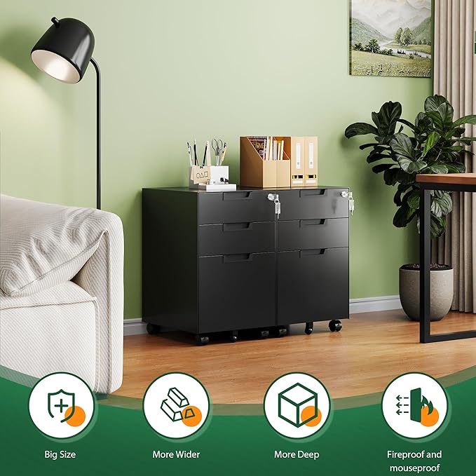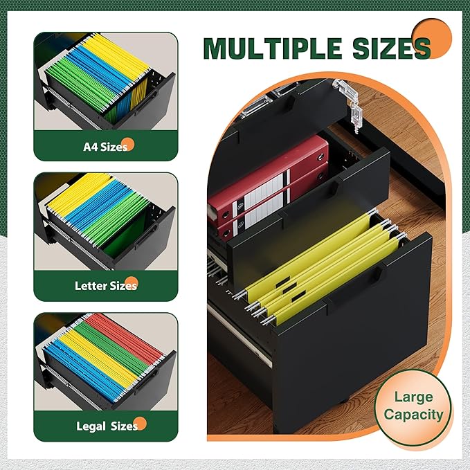 - Practical Design:5 Wheels and 360° rotation caster wheel design easier to move while prevent tipping ,the first two casters can be locked for accident roll away.Hanging-file drawer with adjustable hanging bars can perfectly store letters, legal and A4 size folders front to back or side by side