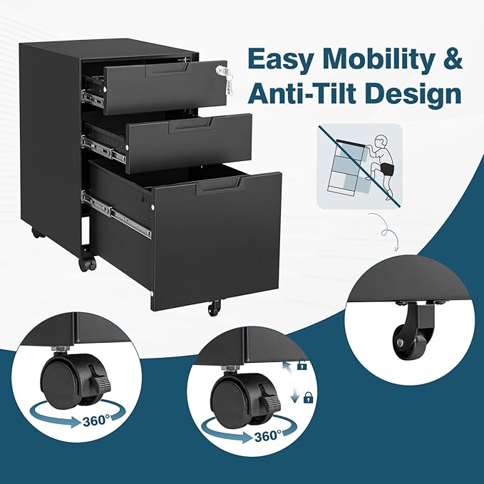 - 【Rolling Fill Cabinet on Wheels】: Equipped with 2 lockable casters + 2 x 360° swivel casters + 1x anti-tilt wheel, you can move it easily and safely. 360° swivel casters go to any direction easily, while lockable casters offer braking and the center support wheel prevents tipping.