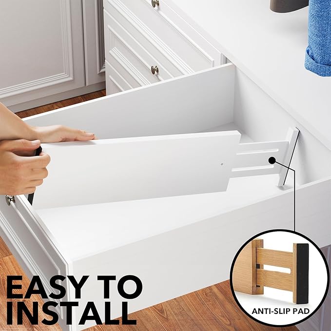 - Drawer Dividers That Stay in Place: Strong spring-loaded design makes them sturdy dividers, with non-slip rubber pads in the end, keeping it stay put all the time and protect your drawers from scratches