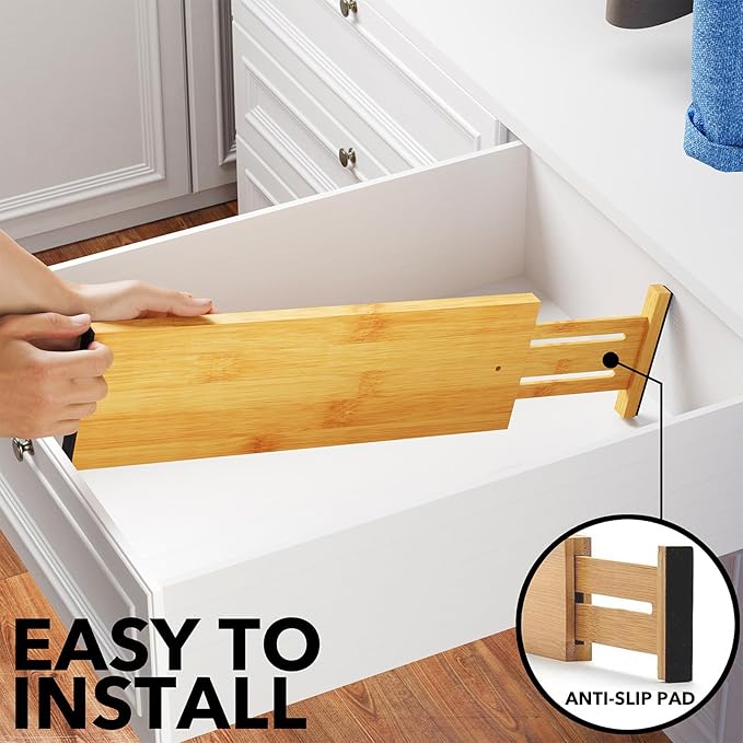 - Drawer Dividers That Stay in Place: Strong spring-loaded design makes them sturdy dividers, with non-slip rubber pads in the end, keeping it stay put all the time and protect your drawers from scratches