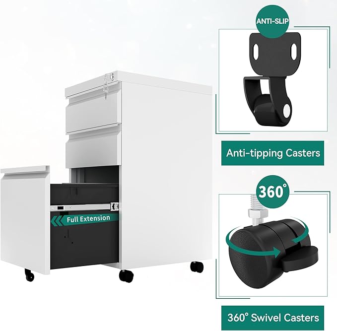 - 【Free-range Mobility with 5 Casters】This lockable filing cabinet has 4 x 360°swivel casters + 1x anti-tipping central caster; Easy and safe to move! 360°swivel casters provide great mobility and the central caster prevents tipping.