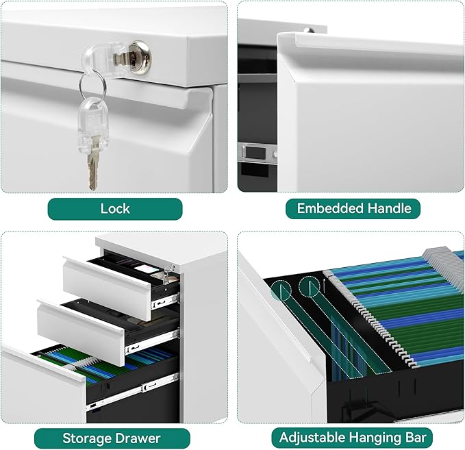 - 【 Large storage drawer 】 Three drawer file cabinet provide large storage space, each drawer provides movable hanging bar, can allow letter size documents to be hung horizontally and vertically, legal and A4 size documents can only be hung vertically, not horizontally; Please carefully measure the size of your desk and documents before purchasing, so that you can better store and organize your documents.