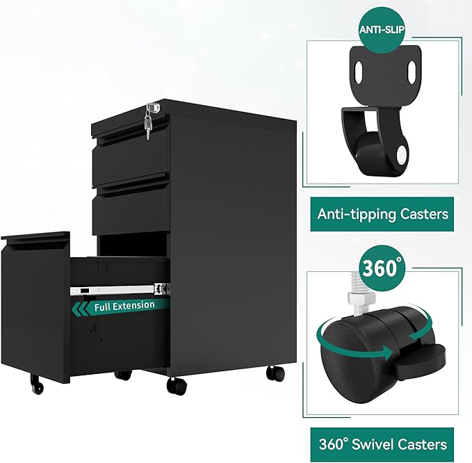 - 【Free-range Mobility with 5 Casters】This lockable filing cabinet has 4 x 360°swivel casters + 1x anti-tipping central caster; Easy and safe to move! 360°swivel casters provide great mobility and the central caster prevents tipping.