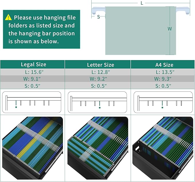 - 【 Large storage drawer 】 Two drawer file cabinet provide large storage space, each drawer provides movable hanging bar, can allow letter size documents to be hung horizontally and vertically, legal and A4 size documents can only be hung vertically, not horizontally; Please carefully measure the size of your desk and documents before purchasing, so that you can better store and organize your documents.