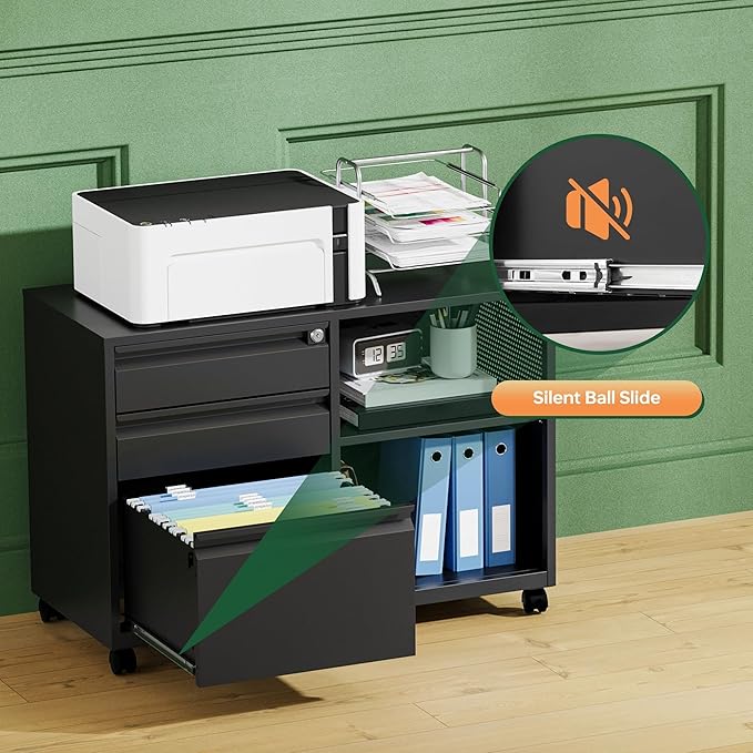 Letaya Mobile 3 Drawer File Cabinet with Lock-Metal Lateral Rolling Printer Stand Filing Cabinets for Home Office-Storage A4/F4/Letter (Black)