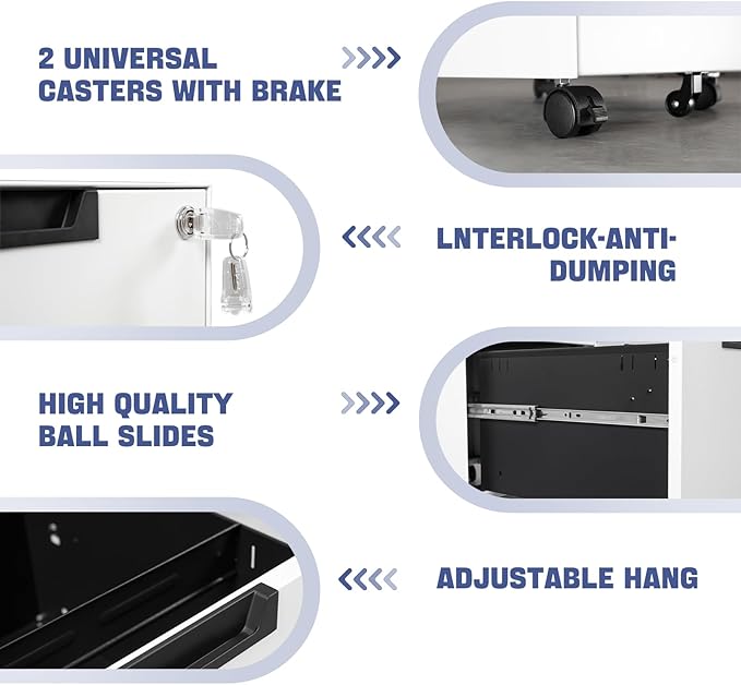 - 【Interlocking System】:The anti-tilt device allows only one drawer to be opened at a time, preventing the filing cabinet from tipping forward. Furthermore, our under desk filing cabinet is equipped with a central lock, which can secure all drawers with just one key, adding an extra layer of security to your home or office.