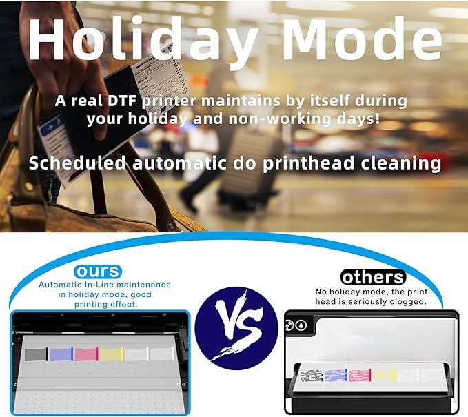- ✅【Smart Holiday Mode】: The M1630 Pro DTF printer automatically maintains printhead health during extended periods of non-use, such as holidays or business trips. This feature ensures that you won't have to worry about clogged printheads or ink tubes when you return.