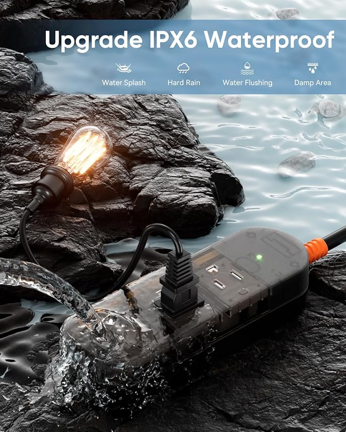 - 【Versatile & Weatherproof】Welcome to our IPX6 rated power strip, resistant to rain, water splashes, and flowing water. It reroutes any liquid intruding the sockets through the back, ensuring functionality in environments like kitchens, outdoors and more.