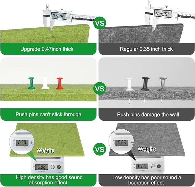 - 【Thickened Cork Boards】Our cork board alternatives have higher thickness (25% thicker) and density (35% denser) than traditional cork boards, which means better durability and sound absorption. It prevents push pins from sticking through the felt board and damaging the wall.