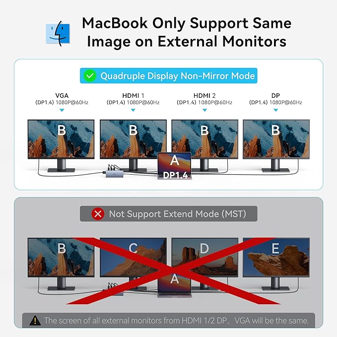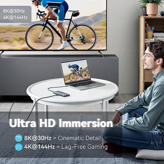 - Laptop Docking Station 4K Display Adapter: The 15 in 1 USB C Hub with 4K Video Output Ports: 2 HDMI+DP+VGA. For Single Display, DisplayPort can reach 8K@30Hz or 4K@144Hz; For Dual HDMI Display and Triple Display(2HDMI+DP), Can Output Up to 4K Dual/Triple Display Videos(For Laptop with DP 1.4 DSC); For Quadruple Display, Dual HDMI, DP, and VGA all are 1080@60Hz. Please Make Sure your Laptop Specification Support DP1.4 Signal Output. If the VGA Port is Connected, It Will Affect the Resolution of All Displays Up to 1080P only.【Please Note: For DP1.2, When Expanding Three Monitors in MST Mode,the Resolution of One of the Monitors Will be Lower Than 1080P@60Hz】