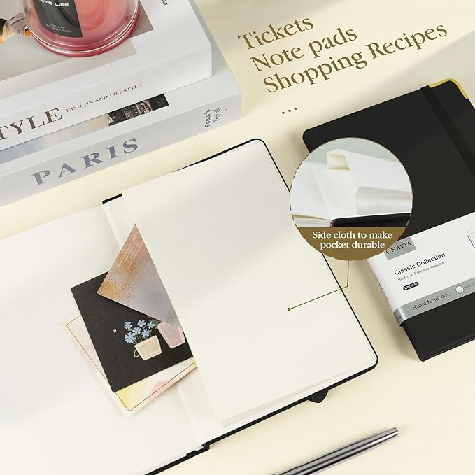 - Humanity Detail Design: A5 Hardcover Journal Note Book features an elastic pen loop, making it more convenient to carry pens of various sizes. The elastic closure band let the hardcover notebook open and close freely. 1 Expandable inner pocket can easily store notes, bills, receipts, appointment cards, and more. And 1 ribbon bookmark helps quickly find the correct page