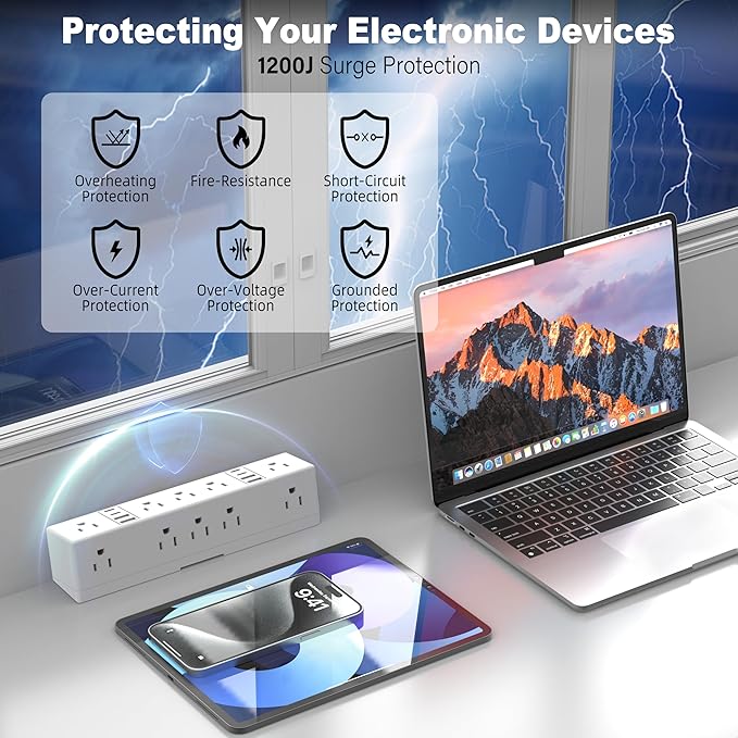 - 【1200J Surge Protection】-Made from fire-resistant ABS plastic, this desk plug station features a built-in circuit breaker for overload, short circuit, and overheat protection, effectively handling voltage spikes.