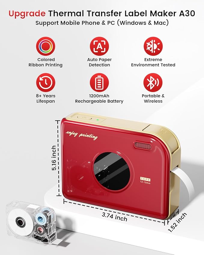 - Inkless, stylish, and ultra-portable: This mini label maker uses inkless thermal technology and connects easily via Bluetooth. Compact enough to fit in pocket, yet powerful enough to bring ideas to life. The A30 home label maker's retro design is perfect present for her/him, families, friends, boy/girl, etc.