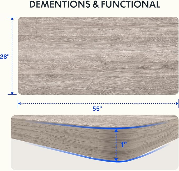 - AMPLE WHOLE-PIECE DESKTOP: With its whole-piece 1” eco-friendly desktop, this standing desk provides plenty of room for your computer setup, documents, and accessories, creating a well-organized and productive work environment. Due to hand measurements, desktop dimensions may vary slightly by 0 to 1”.