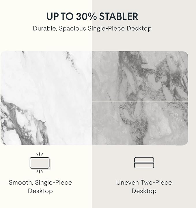 - AMPLE WHOLE-PIECE DESKTOP: With its whole-piece 1” eco-friendly desktop, this standing desk provides plenty of room for your computer setup, documents, and accessories, creating a well-organized and productive work environment. Due to hand measurements, desktop dimensions may vary slightly by 0 to 1”.