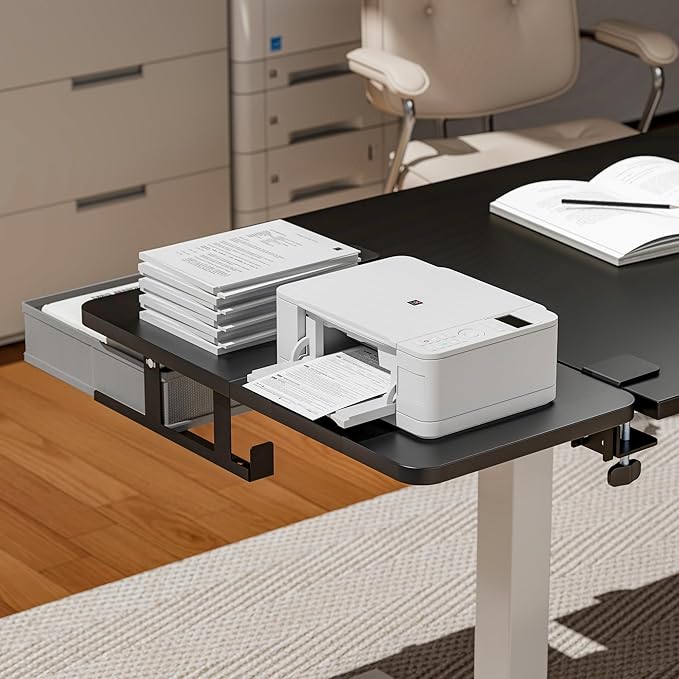 - MULTIFUNCTIONAL USE AND OPTIONS: This desk extension is designed to hold office supplies, laptops, keyboards, mice, printers, and more. It works as a desk armrest, shelf, desk extension, keyboard and mouse tray or equipment stand. Available in three colors (black, white, and walnut) and two sizes (medium and large), it meets various aesthetic and functional needs for different workstation setups.