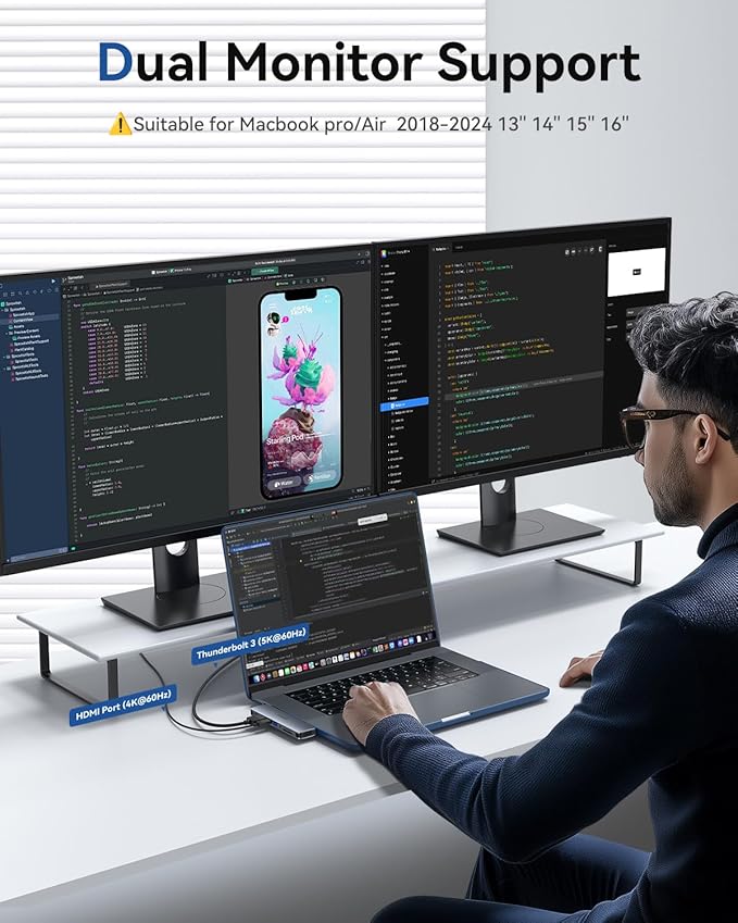- HD Crystal-like Picture Quality: By connecting the HDMI (4K@60Hz) and Thunderbolt 3 (5K@60Hz) ports of this macbook hub, it brings you an ultra-high-definition visual feast. You can realize HD dual monitors with 4K HD picture quality and 5K brings 3D effect as if you are in the real world. You can extend two different monitors at the same time through this macbook accessories (mirroring or expansion mode), and even extend the picture to the TV or projector outside the monitor, so you can work efficiently, but also can't better relax and enjoy life. Note: MacBook models with the M1, M2, or M3 chip do not support dual external displays at the same time