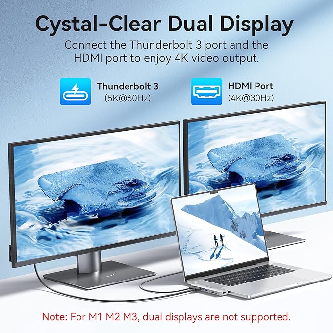 - Enhanced Connectivity with 4K HDMI and 5K Thunderbolt 3 MacBook Hub: Elevate your MacBook experience with our versatile USB C Hub. Enjoy stunning 4K resolution at 30Hz through the HDMI port and immersive 5K visuals at 60Hz via the Thunderbolt 3 port. Achieve Dual Monitor Display effortlessly—mirror or extend your laptop screen to TVs, monitors, or projectors. Note: MacBook models with M1, M2, or M3 chips do not support dual external monitors simultaneously