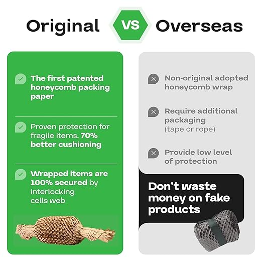 - 【THE ONLY PROVEN SLIT PAPER TECHNOLOGY】 The HexcelWrap produced by the slit paper technology was developed over 30 years ago, and it's been proven to be an effective packing material. Due to the engineered hexagonal cells, this honeycomb wrapping expands as you wrap your items, creating an interlocking web trap. The resulting three-dimensional cushioning product (paper) replaces traditional plastic, bubble, and other paper-based packaging products in terms of properties and efficiency