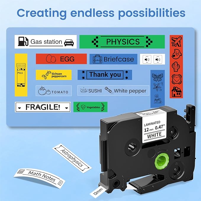 - 【Replaced for Brother P Touch Pth110 Tape Color Durable and Non-fading】 Tz tape white on color and Compatible with Brother label maker tape color won't fade even when exposed to sunlight, won't flake or curl over time. Tz tape 12mm white strong adhesion, water withstand, wear withstand, corrosion withstand, high and low temperature withstand, grease withstand