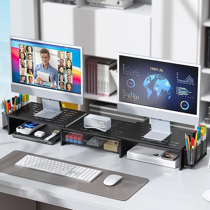 gianotter Computer Dual Monitor Stand Riser For Desk, Desk Organizers And Accessories With Drawer And 2 Pen Holder For Office, Home, School Supplies (Black)