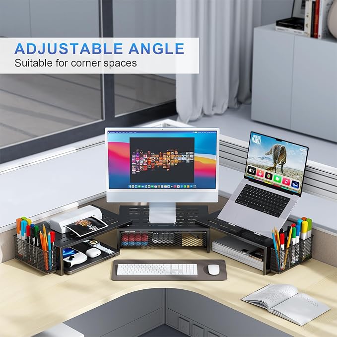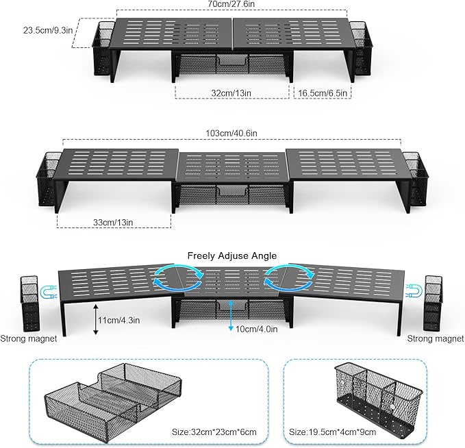 - 【Multiple configuration modes】: The desk monitor stand riser has adjustable length (27.6-40.6 inches) and angle, which can be freely adjusted according to your preferences, not only bringing you comfort, but also improving your work efficiency.