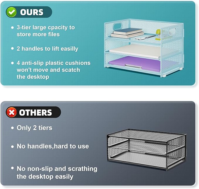 - 【MULTI-PURPOSE ORGANIZER】3-tier layered design and large capacity make the paper organizer become an ideal choice for managing all kinds of letter-size letters, paper, books, bills, etc. Let you quickly identify the contents of each compartment super easy!