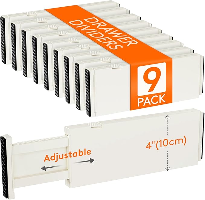 Lifewit 9 Pack Drawer Dividers 4" High, 11-17" Adjustable Drawer Organizers for Clothes, Expandable Dresser Separators in Bedroom/Bathroom/Kitchen/Fridge/Office Organization and Storage, Beige