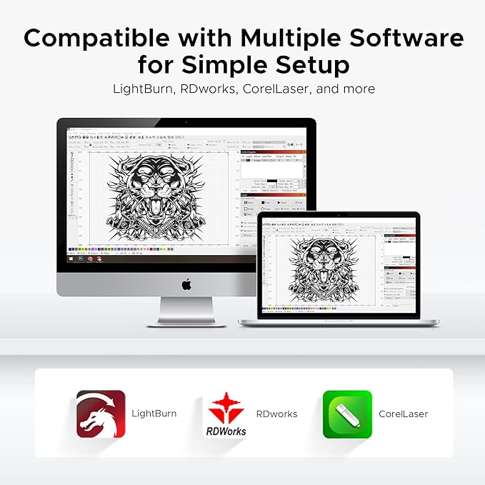 - Easy to Use: The 5MP camera provides real-time high-res views for accurate pattern adjustments. With the Ruida control board, you can easily upload designs through LightBurn, CorelDRAW, or other software via WiFi, Ethernet, or USB