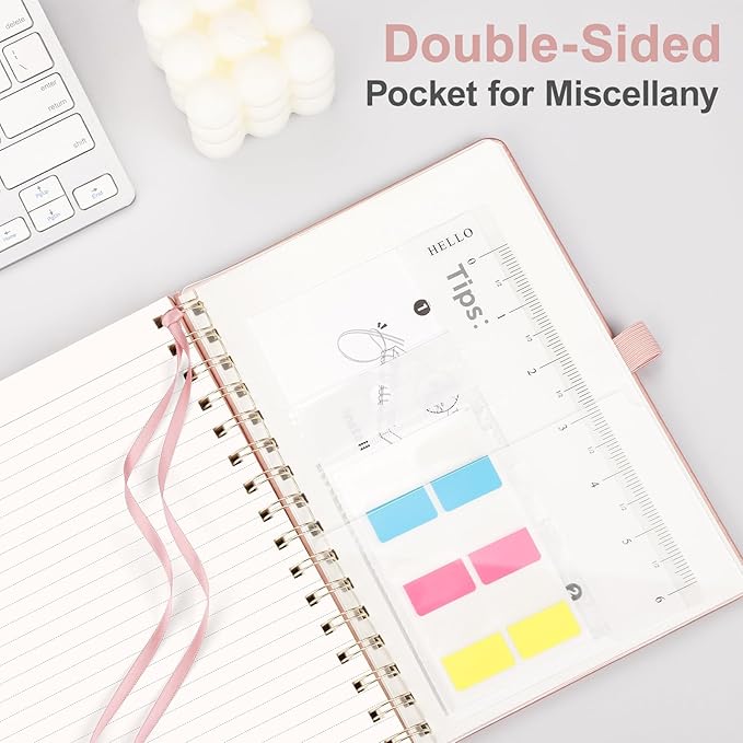 - PRACTICAL LAYOUT: Equipped an elastic band, a pen holder and removable bookmark ruler to keep your notebook organized. Comes with a DIY bookmark with a ribbon for self-attachment to the spiral, serving as a bookmark. Features a double-sided pocket for storing miscellany and 18pcs sticky notes for additional organization and reminders