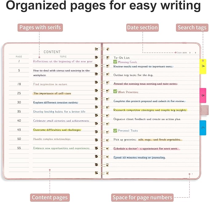 - ORGANIZED AND PRACTICAL NOTEBOOK: Our lined spiral notebook features 140 numbered pages and 4-page blank table of contents. In a medium A5 size 5.7" × 8.3", providing ample writing space while remaining lightweight and easy to carry