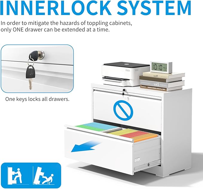 - 【Safety & Security】Interlock system prevents tipping and does not allow multiple drawers to be opened at the same time. The smooth, quiet sliding rails make opening and closing drawers effortless and noise-free. One lock with 2 keys secures all 2 drawers, it ensures that your files remain safe from unauthorized access.