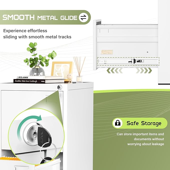 - 【High security】Three-drawer file cabinet with Lock is equipped with a built-in interlocking system to ensure drawer security. One locks with two keys ensures that your files are safe and easy to manage. The cabinet with drawers can be locked into three drawers at the same time with a lock, which is smooth and easy to operate.
