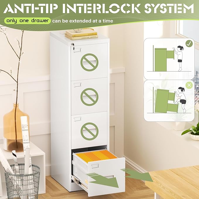 - 【High security】Four-drawer file cabinet with Lock is equipped with a built-in interlocking system to ensure drawer security. One locks with two keys ensures that your files are safe and easy to manage. The cabinet with drawers can be locked into four drawers at the same time with a lock, which is smooth and easy to operate.