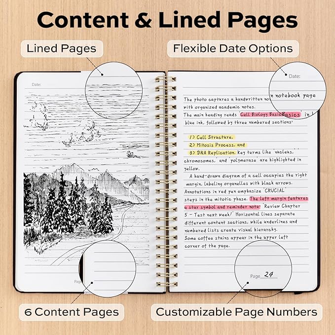 - Hardcover Spiral Journal: Lined Spiral Journal Notebook features a high-quality waterproof leather cover with excellent durability and waterproof function, effectively protecting the inner pages from damage, while the rounded corner design provides comfortable handling and an elegant appearance.
