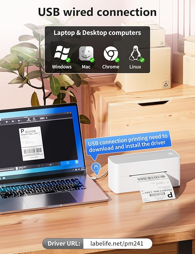- [Print via USB Cable] - For PC, Windows, Mac OS, Chrome OS, and Linux systems. For Chrome OS, need to enter “Labelife” in the Chrome web store and add the extension to your Google Chrome. (PC printing needs to download the driver: labelife.net/pm241)