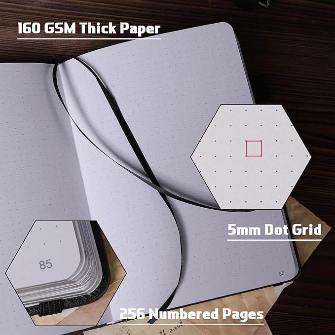 - 160 GSM Thick Paper: The dot matrix journal is made of 160gsm extra thick paper, drawing and writing won’t penetrate the ink, this is tested by us, the writing surface is white and acid-free, there are 256 pages, each page is numbered, the dots are 0.5 cm, leaving enough space for your imagination.