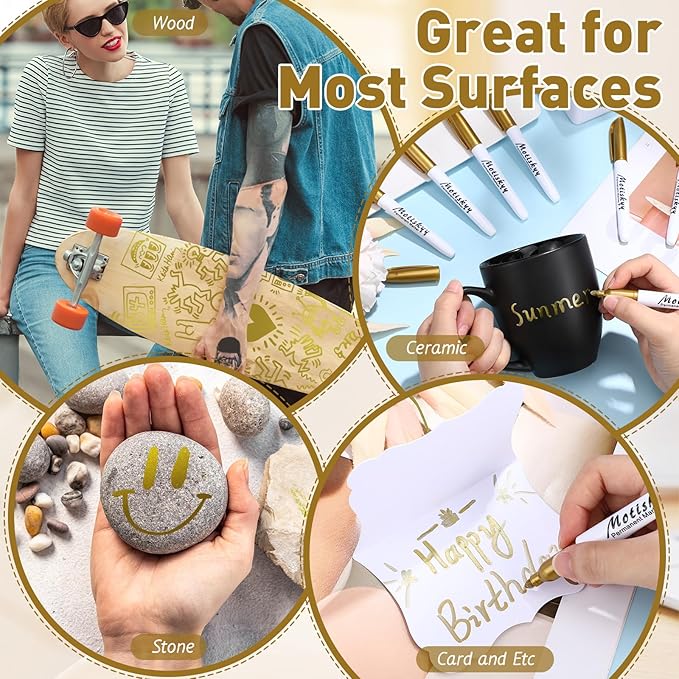 - Multiple Uses: gold metallic permanent markers that can add a metallic texture, great for making thank you cards, birthday cards, DIY photo albums or scrapbooks, signing, drawing, DIY gift bags, label storage, etc., or giving as Christmas and birthday gifts