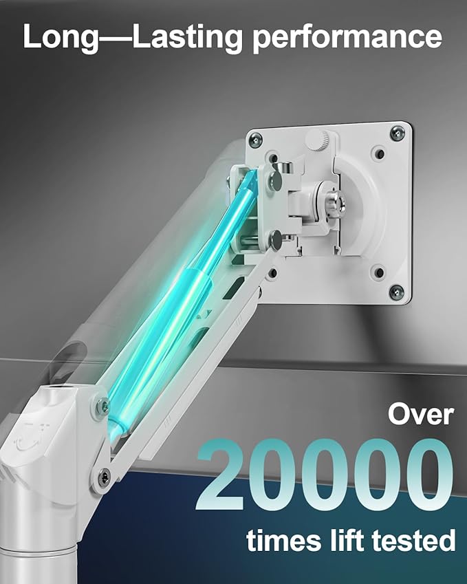 - Strong Support: The computer stand is designed with aluminum arm and a strong gas spring that has undergone 20,000 motion tests to ensure long-lasting performance and provides excellent stability to support monitors from 4.4 to 22 lbs. You can extend the monitor arm out 19.7″to bring your screen closer or raise it up to 17.3″above the desk surface for a better viewing position. This dynamic adjustment makes it possible to position your screen closer to eye level for more comfort.