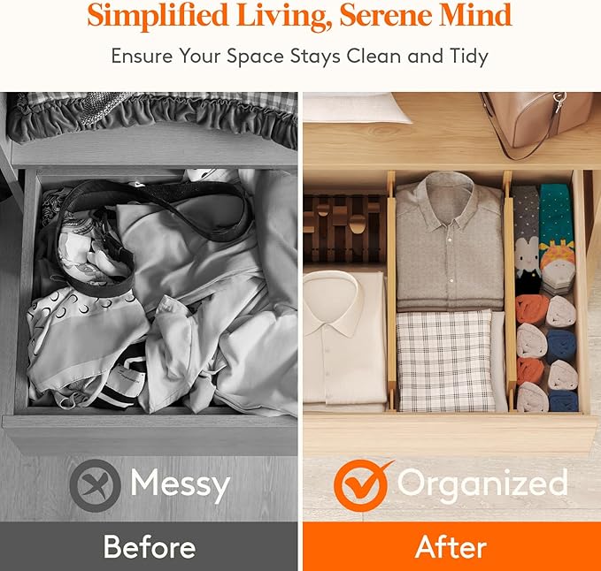 - Adjustable to Fit: Our dresser organizers have a flexible length range of 16.4-22.2 inches (41.7-56.4 cm), with 0.6 inches (1.5 cm) wide and 6 inches (15.2cm) tall; Easily installed in most drawers, they keep your items organized and accessible