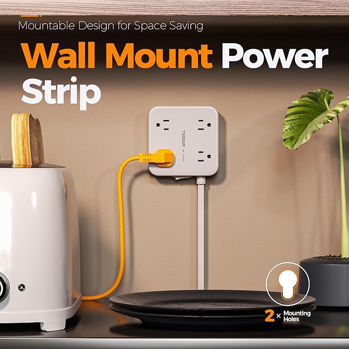 - Mountable Power Strip: 2 mounting holes design allow the extension cord flat wall plug securely installed in various applications, such as wall mounts, floor mounts, under counters and more; 4 rubber feet at the bottom efficiently keep it from slipping and sliding
