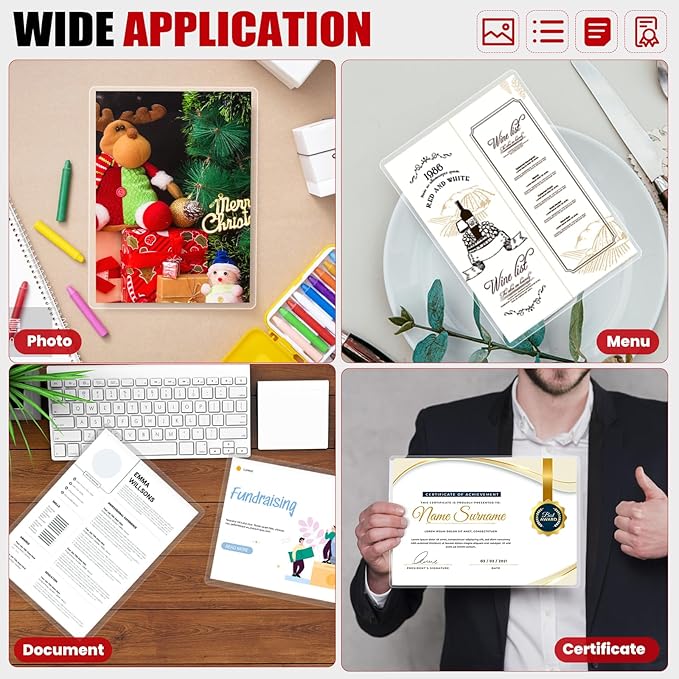 - Premium Material: Crystal clear, glossy sheen, sturdy and Premium material. Laceration resistant, double coating, anti-stain, sturdy and waterproof, protect your document from scratching.