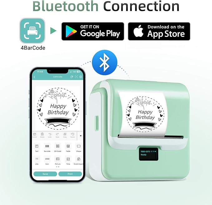 - Powerful App: With Bluetooth connectivity, you can use the free 4Barcode app, which offers over 150 ready-to-use label templates to boost your efficiency; You can also design and save your own templates with access to 80+ fonts and 670+ icons; The app supports a variety of features, including QR codes, barcode labels, tables, materials, timestamps, numbers, text, icons, and more, enabling fully customized label creation