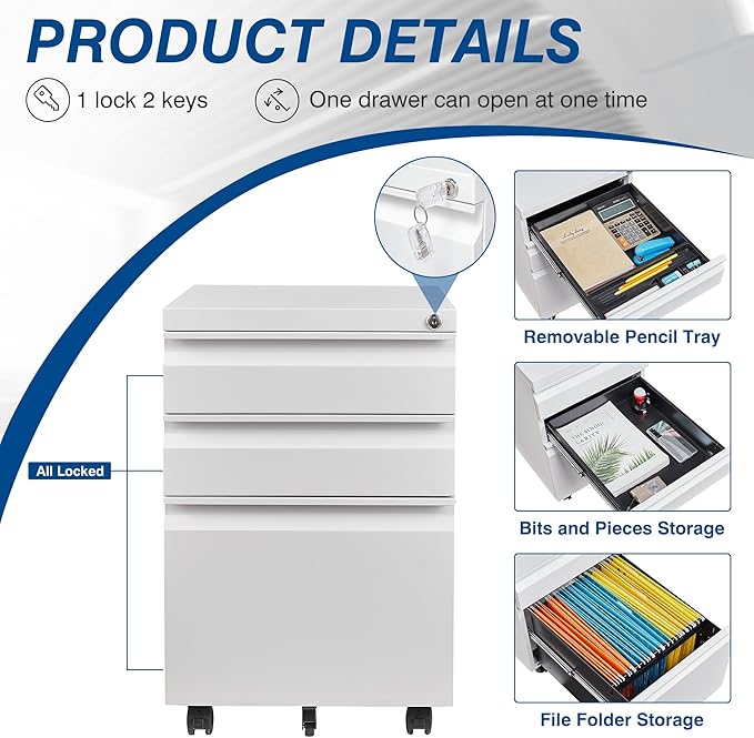 - CAN BE PLACED EVERYWHERE - Thanks to the compact design and five flexible wheels of this filing cabinet, you can easily putting it under the desk, next to the sofa, in the bedroom to using as a under desk file cabinet, a bedside tables etc.