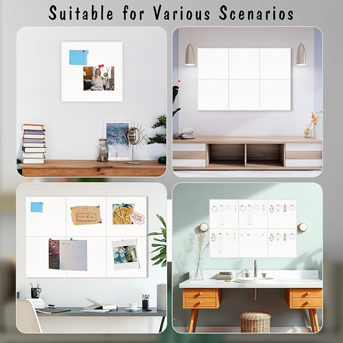 - 【Package Includes】You will receive 6 pack felt wall tiles and 1 box colorful thumbtacks (about 30pcs). The size of each felt wall tile is 11.8" x 11.8" and the thickness is about 0.35". You can splice them into the desired shape and size according to your needs, such as 36" x 24", 12" x 72", etc.