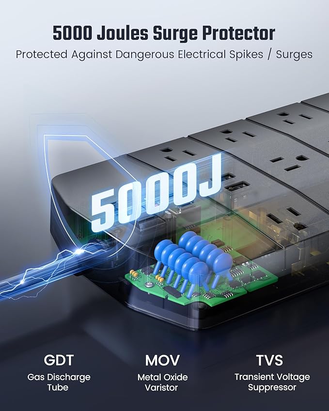 - 5000 Joule Surge Protector: With industrial-grade massive 5000 joules of surge protection, the built-in surge protector offers you peace of mind, safeguarding your valuable electronics from potential power surges and voltage fluctuations. The surge protector has LED indicators to let you know whether your devices are safe