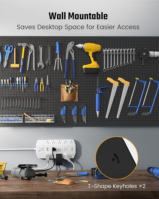 - Space-Saving Design: A clean workspace is essential for efficiency and productivity. A 45° flat plug is meticulously designed to fit in tight spaces behind the workbench or furniture, while leaving the bottom outlet usable. Screws and a drill template are included for you to easily wall-mount the power strip for easier access to power.