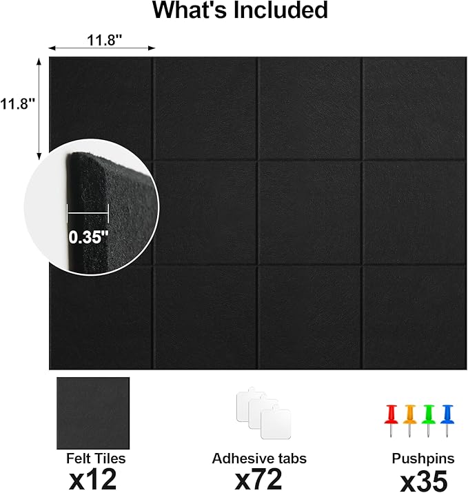 Large Cork Board for Walls 47" x 35" 12 Pack Black Bulletin Boards Felt Wall Tiles with Safe Removable Adhesive Corkboards for Office Home,Black