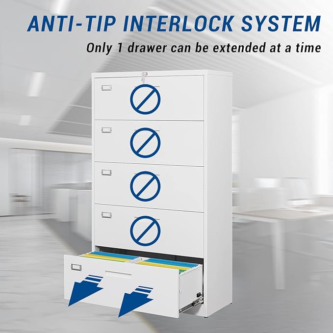 - ANTI-TILT DESIGN- When you fully open one drawer of this file cabinet, the other drawer cannot be opened. This is to prevent the drawer from storing too much paper and causing the cabinet to topple over.