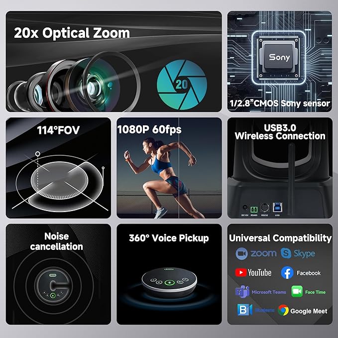 - FULL HD VIDEO CONFERENCING WIRELESS EQUIPMENT SYSTEM. Conduct your Hybrid meetings with the TONGVEO 20X wireless PTZ conference camera system. Pan Tilt Camera with 114° wide field of view with no video distortion.Offers better video and audio solutions. Elevate your collaboration efforts with superior sound and picture quality for enhanced productivity. Launch video and audio meetings easily at video calls, video conferences, online courses, Telemedicine, remote training, remote interviews, etc.